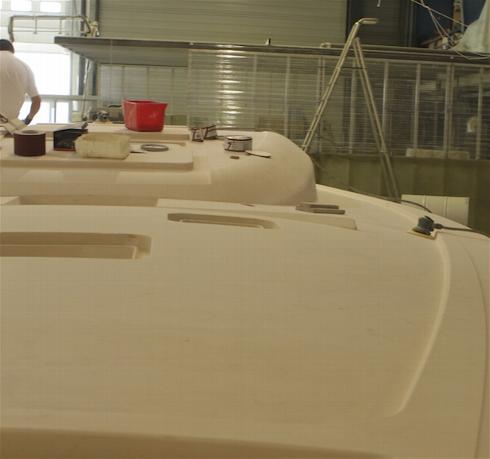Dans le cadre de la fabrication d'un moule composites, une couche de stratification NCL sera appliquée sur la maquette (maître modèle) pour en faire une "pièce mère", et un moule sera fabriqué à partir de cette "pièce mère" (en bleu sur l'image ci-dessous de la fin de fabrication d'un moule de coque d'un voilier de 15 mètres).
